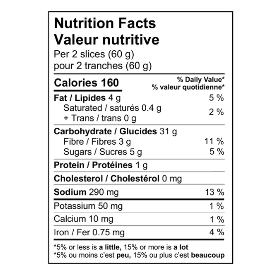 Ingredients: Water, Gluten-free flour blend (modified tapioca starch, corn starch, potato starch), Sprouted grain blend (sprouted brown rice flour, gluten-free sprouted rolled oats), Sugars (cane sugar, honey, dextrose, raisin juice concentrate), Sunflower oil, Yeast, Psyllium husk, Modified cellulose, Vinegar, Pea hull fibre, Salt, Cultured cane sugar, Xanthan gum, Rice bran, Cellulose gum, Enzymes.