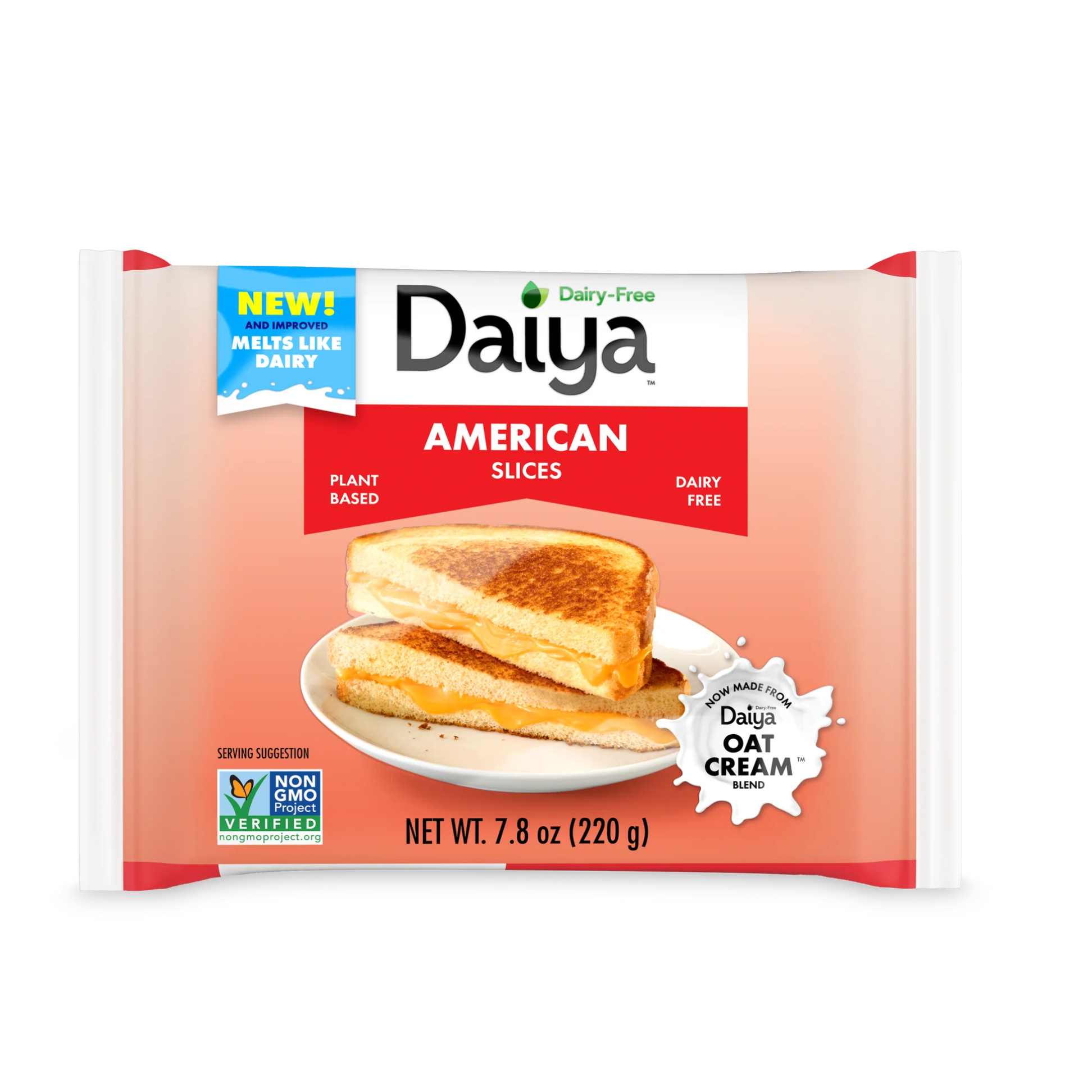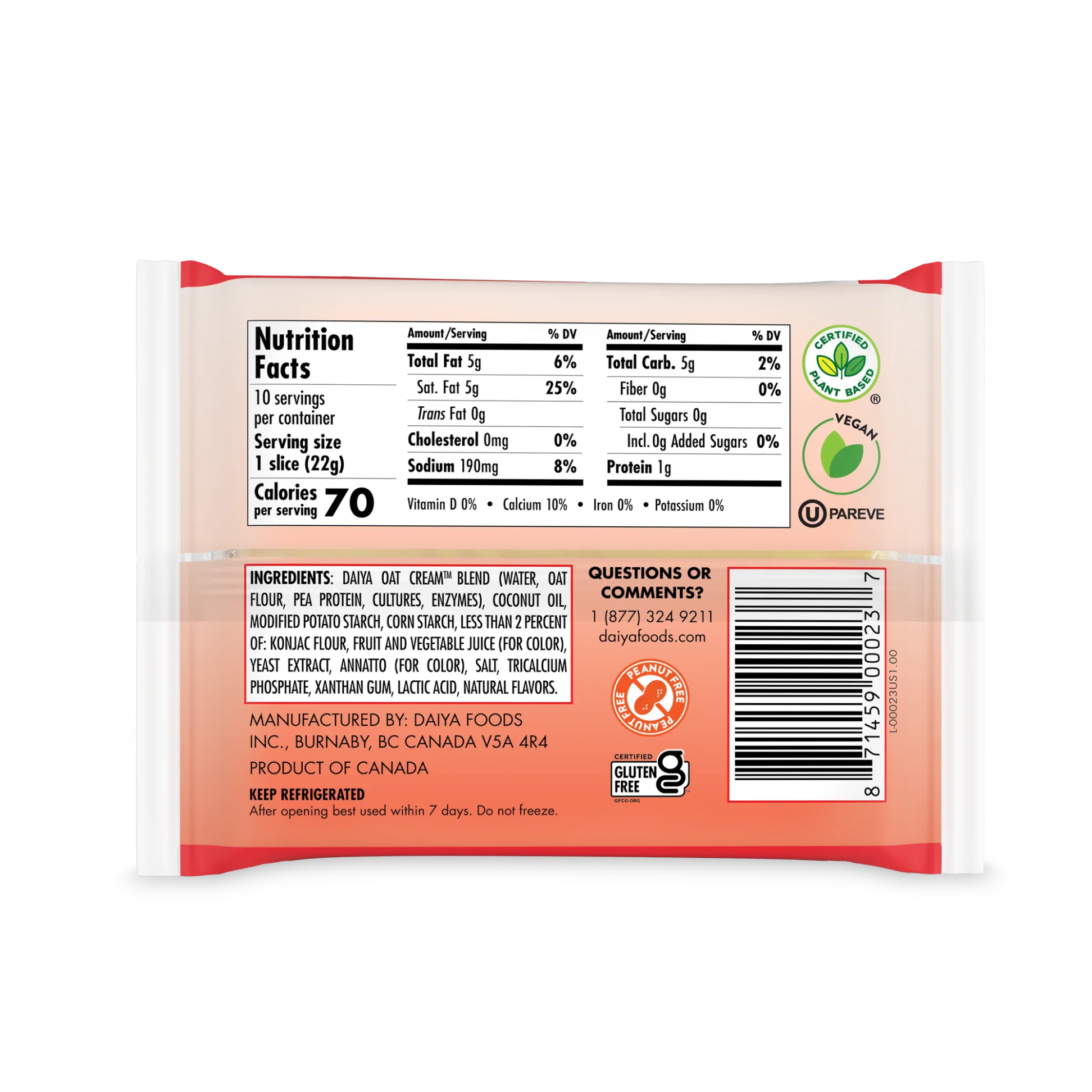 Ingredients: Daiya Oat Cream™ blend (water, oat flour, pea protein, cultures, enzymes), Coconut oil, Modified potato starch, Corn starch, Less than 2 percent of: Konjac Flour, Fruit and vegetable juice (for color), Yeast extract, Annatto (for color), Salt,Tricalcium Phosphate, Xanthan gum, Lactic acid, Natural flavors.