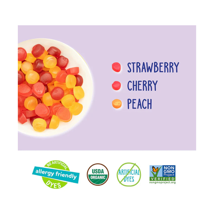 Dive into the deliciousness of our allergy-friendly and organic Fruit Snacks with mouthwatering flavors like strawberry, banana, cherry and peach!These tasty bite-sized treats are classroom-safe and perfect as a lunchtime snack, an afternoon treat, party favor, Valentine exchange, Easter basket, Halloween goodie bag sweet, stocking stuffer, and an on-the-go snack!