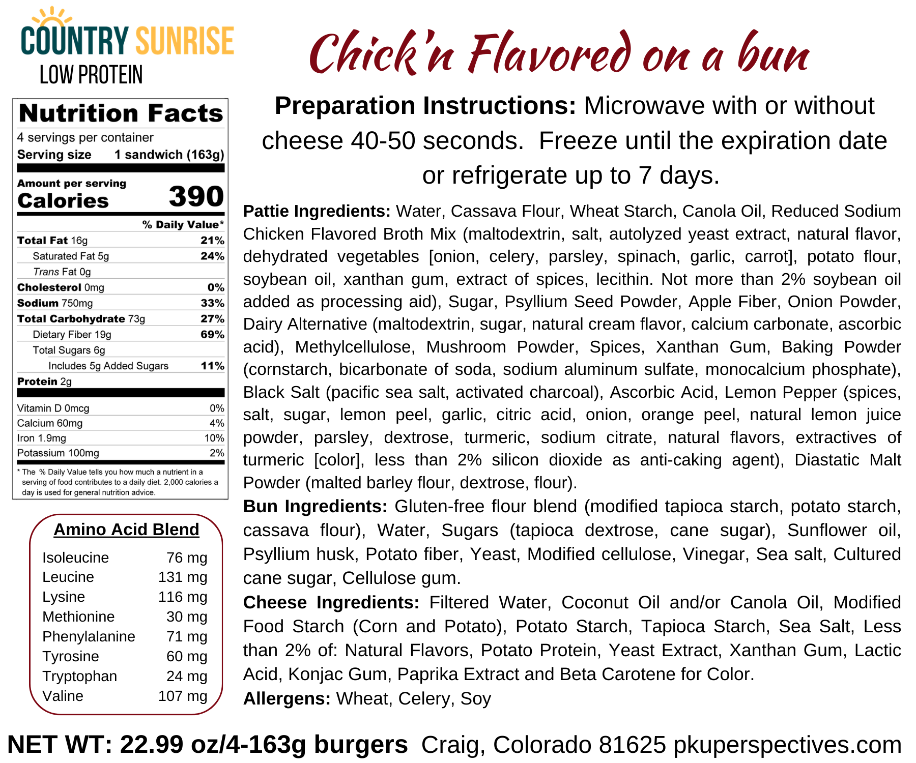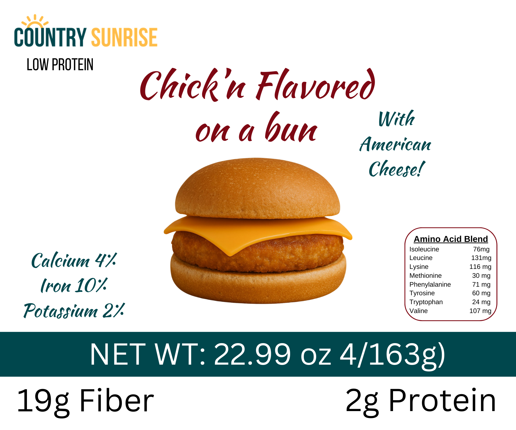 The Country Sunrise Chick’n (flavored) on a bun with cheese is a unique, low-protein alternative to the classic chicken sandwich. Made with a favorite Country Sunrise Chick’n (flavored pattie), it’s flavorful and low in protein. It features a gluten-free, low-protein bun and dairy-free American cheese, perfect for low-protein diets. Customize it with your favorite low-protein condiments. Microwave or grill it for a tasty meal option. Toast the bun for added crunch and flavor. Enjoy a delicious meal that meets your dietary needs.
