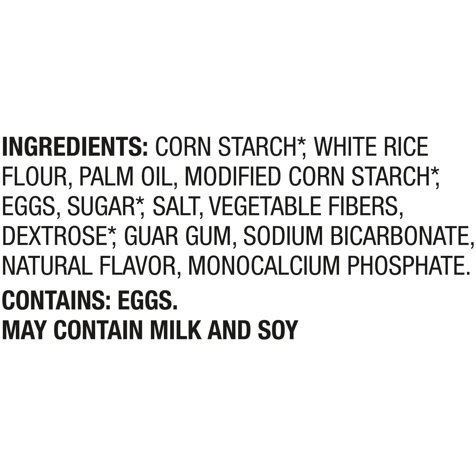 Ingredients: CORN STARCH*, WHITE RICE FLOUR, PALM OIL, MODIFIED CORN STARCH*, EGGS, SUGAR*, SALT, VEGETABLE FIBERS, DEXTROSE*, GUAR GUM, SODIUM BICARBONATE, NATURAL FLAVOR, MONOCALCIUM PHOSPHATE.