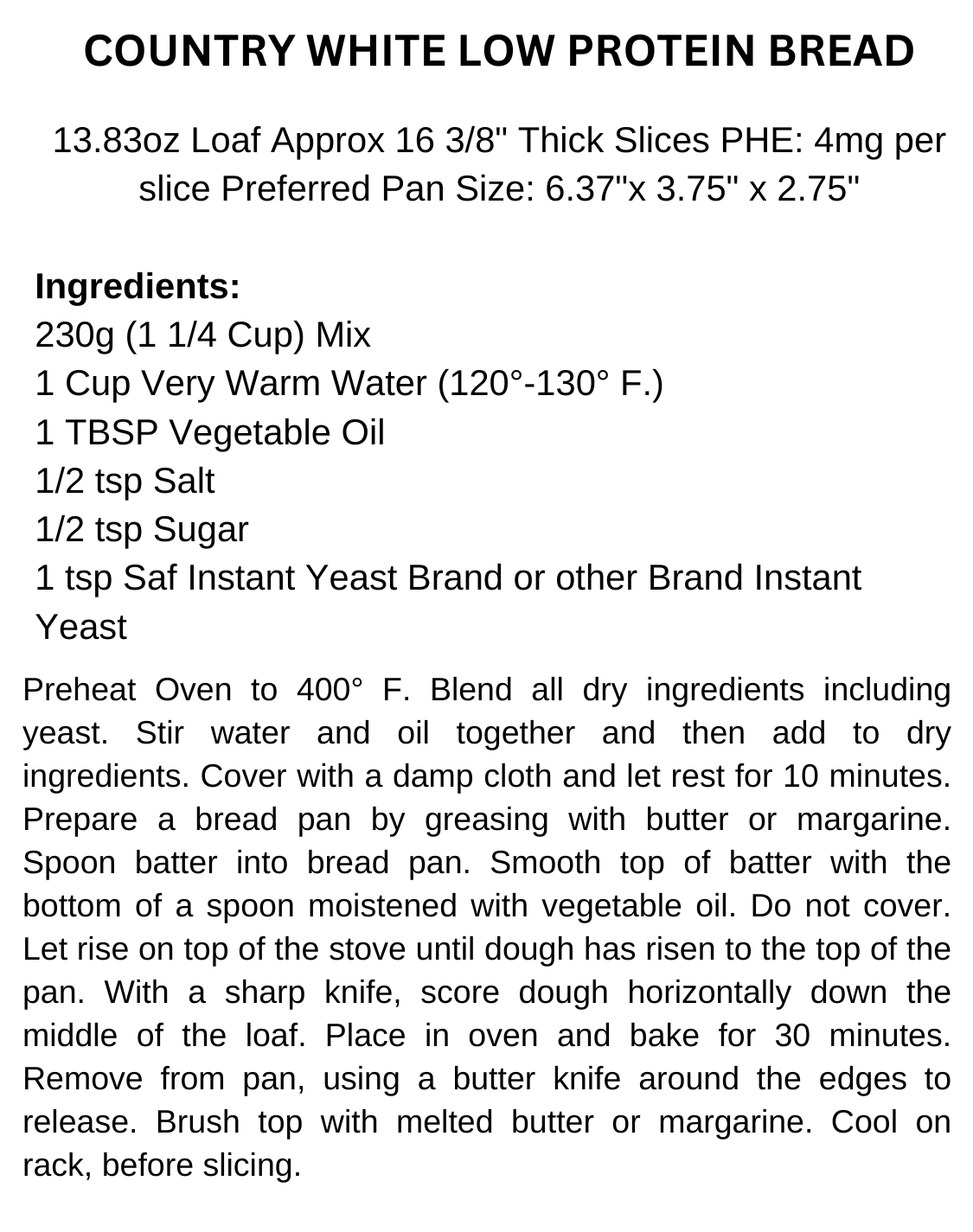 • Prepared Bread Loaf: 13.83oz Loaf Approx 16 â…œ” Slices PHE: 4mg per 24.5g slice