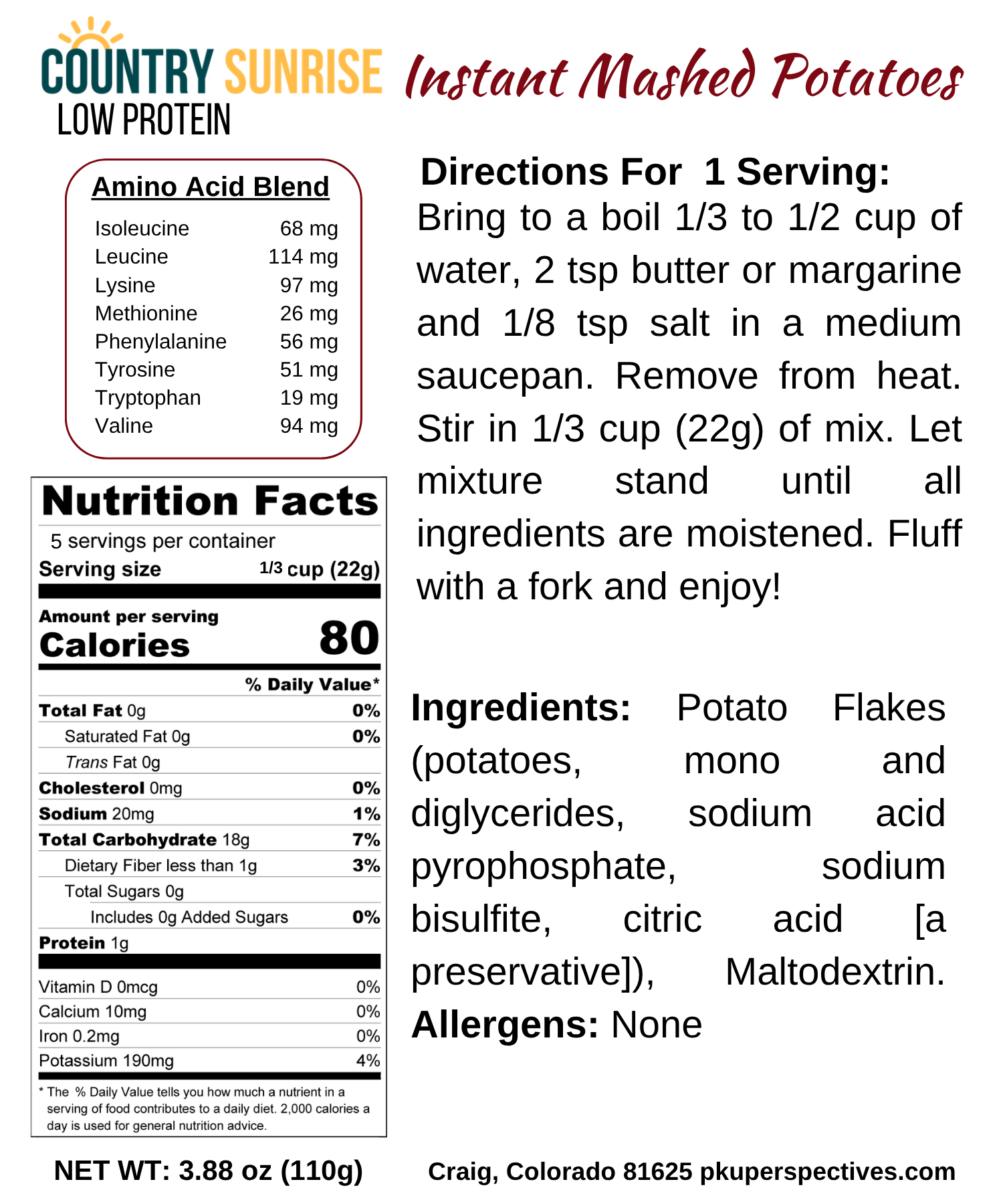 Enjoy creamy, smooth mashed potatoes in minutes! Country Sunrise Instant Mashed Potatoes are specially formulated for low-protein diets, providing comforting flavor and easy preparation without the excess protein. Perfect as a side dish or quick meal base.