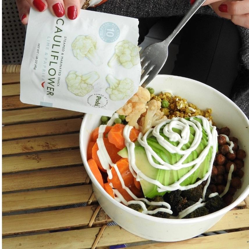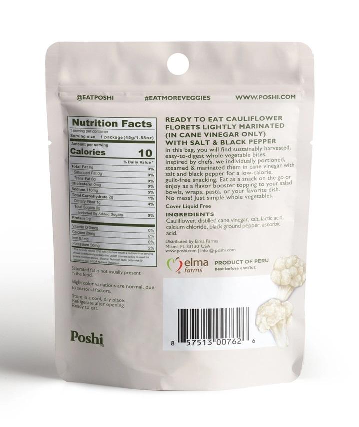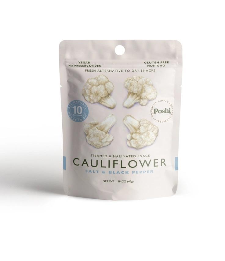 Poshi – Steamed & Marinated Cauliflower – Salt & Black Pepper 1.58oz/10ct. Poshi veggie packs are peeled, steam cooked, lightly marinated, and ready to eat! Add hot or cold to any recipe as an ingredient or topping from salad bowls to pasta, and even wraps, and pizza. Possibilities are endless! All-natural premium vegetables with a clean crisp taste Fully cooked & ready to eat Lightly marinated with vegetables and Extra virgin Olive oil Vegan, Low calorie, Non-GMO, Gluten-Free, Nuts & Soy Free, Kosher 0g added sugars No mess! Cover Liquid Free