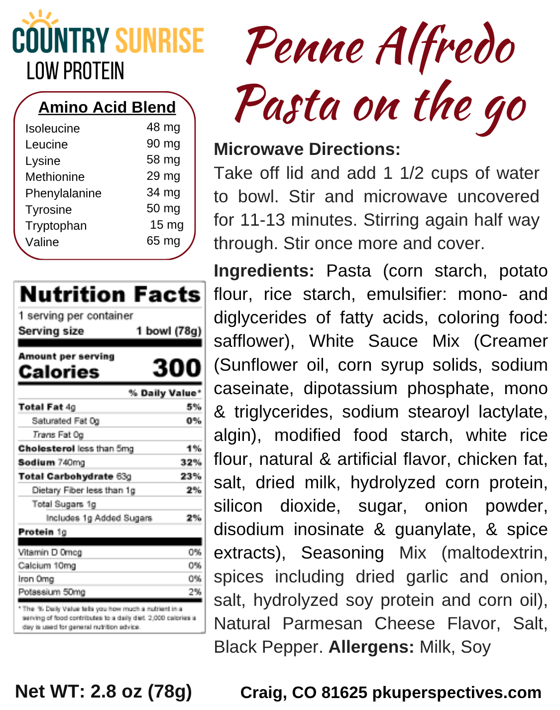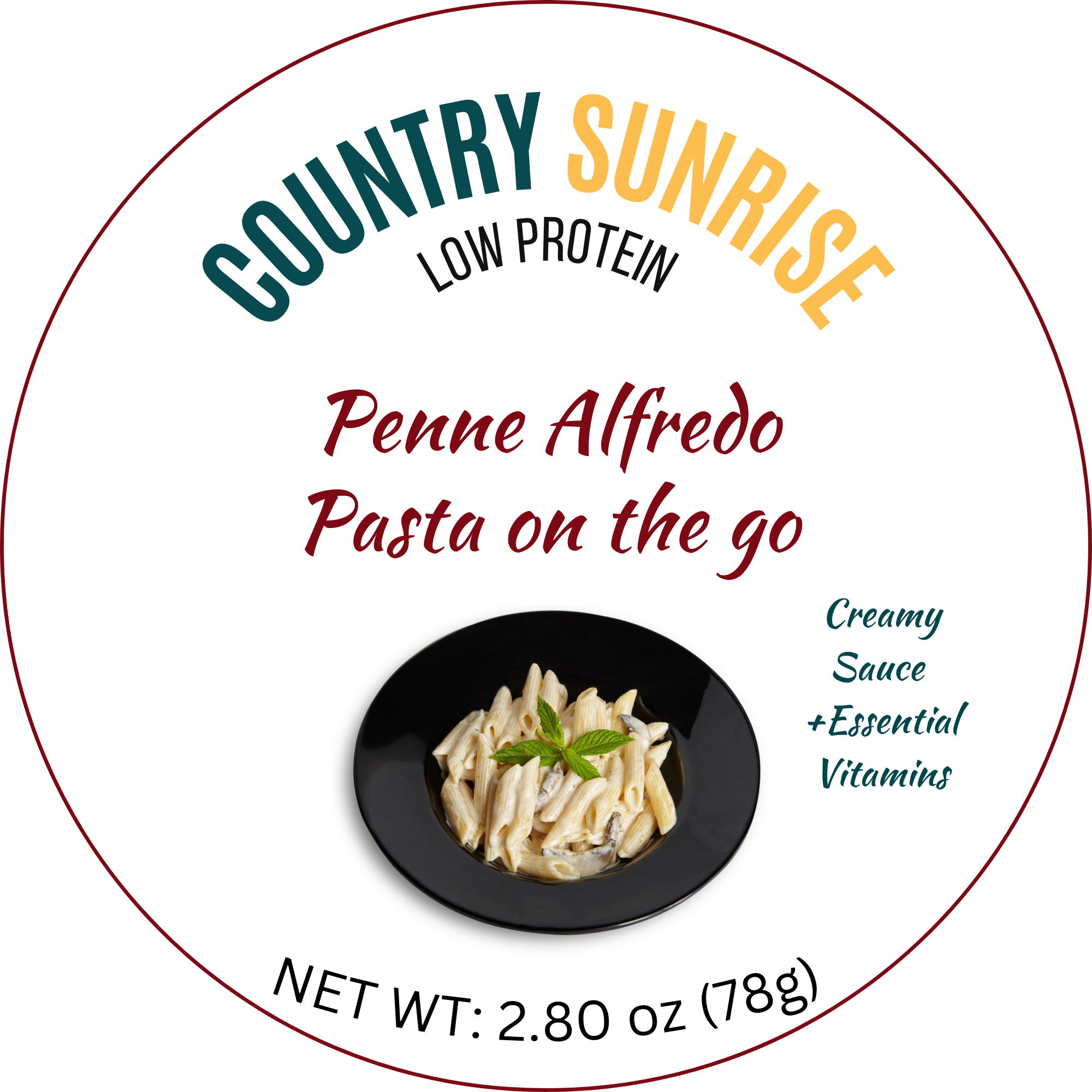 Crafted with low-protein penne pasta and a rich white sauce blend, this comforting dish is perfect for anyone looking for a delicious, balanced option on the go. The creamy Alfredo flavor comes from a special mix of ingredients, including Parmesan-style cheese, sunflower oil creamer, and natural seasonings like garlic, onion, and black pepper — bringing you the flavor of home-cooked pasta without the fuss.
