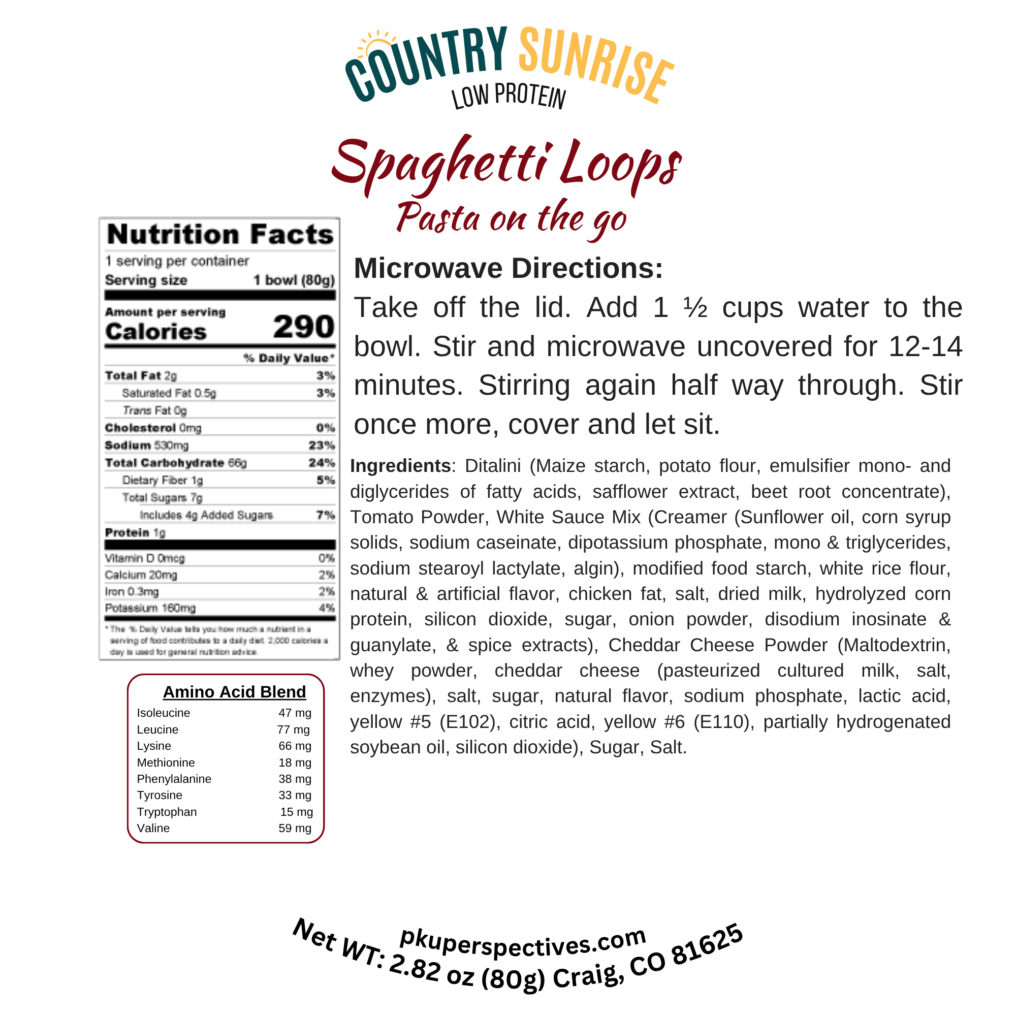 Looking for a fast, low-protein meal that doesn’t compromise on taste? Country Sunrise Spaghetti Loops is your perfect pasta-on-the-go solution! A rich, savory tomato blend crafted to deliver real comfort and taste in every bite. Designed specifically for individuals with PKU or low-protein dietary needs, this convenient meal is easy to prepare—just add water and microwave.