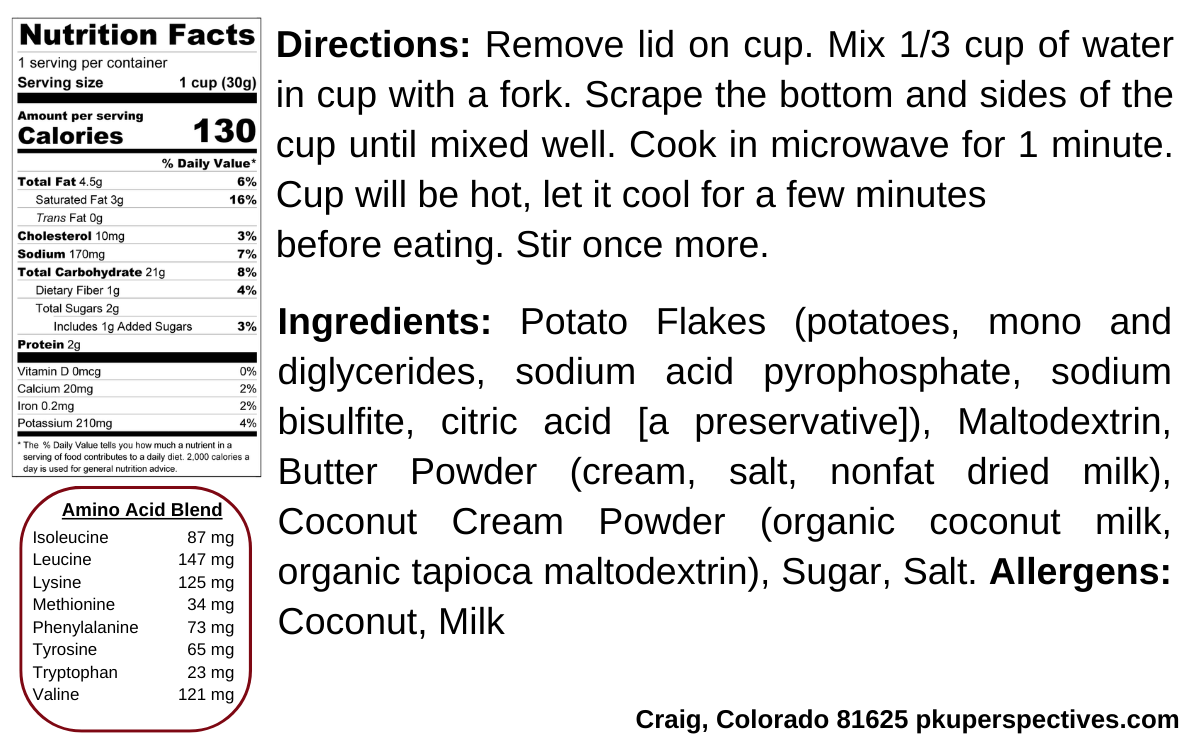 The Country Sunrise Original Mashed Potatoes On-the-Go Cup is a convenient single-serve option designed for individuals following a low-protein or protein-restricted diet, including PKU, MSUD and CKD (chronic kidney/renal diets). Made with real butter flavor, this comforting staple is easy to prepare and perfect for busy days at home or away.