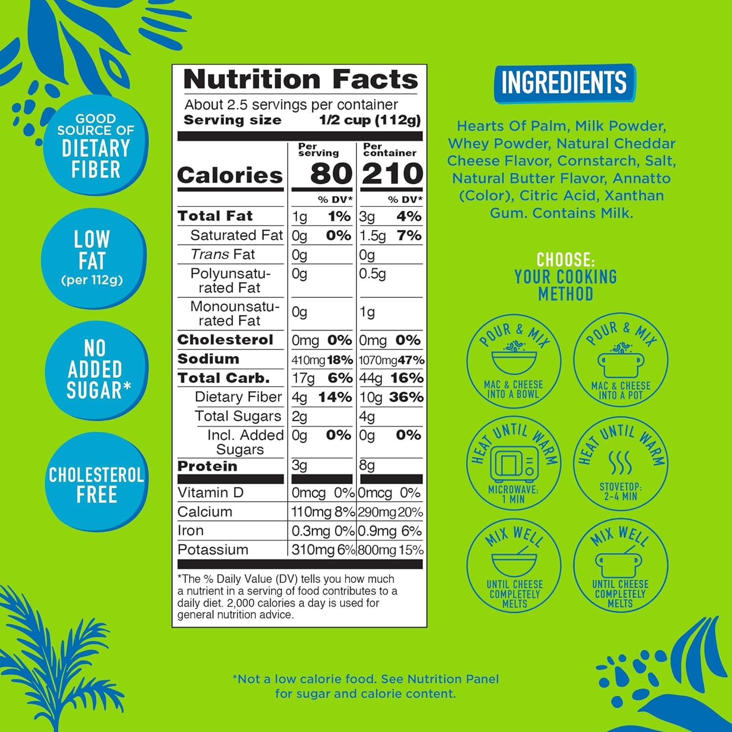 Ingredients: Hearts of Palm, Milk Powder, Whey Powder, Natural Cheddar Cheese Flavor, Cornstarch, Salt, Natural Butter Flavor, Annatto (Color), Citric Acid, Xanthan Gum
