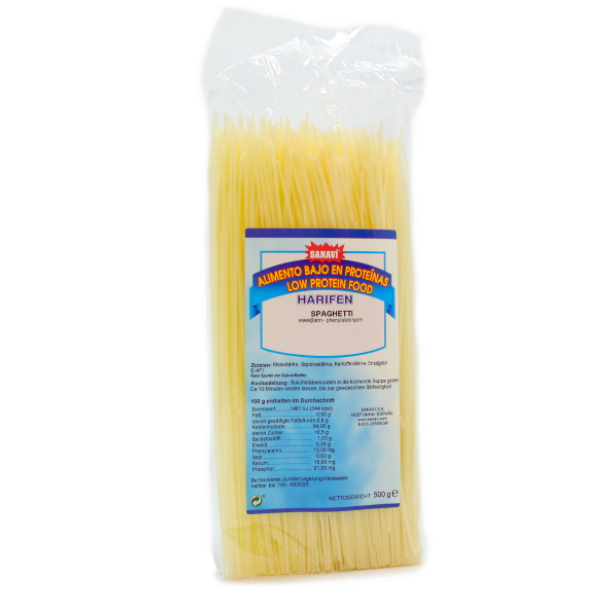 Harifen spaghetti are a tasty, low-protein, starch-based alternative to diet as part of a protein-reduced diet for PKU, MSUD or similar diseases of protein metabolism. Harifen Spaghetti contains only 13.30 mg Phe / 100g and can be prepared quickly and easily.