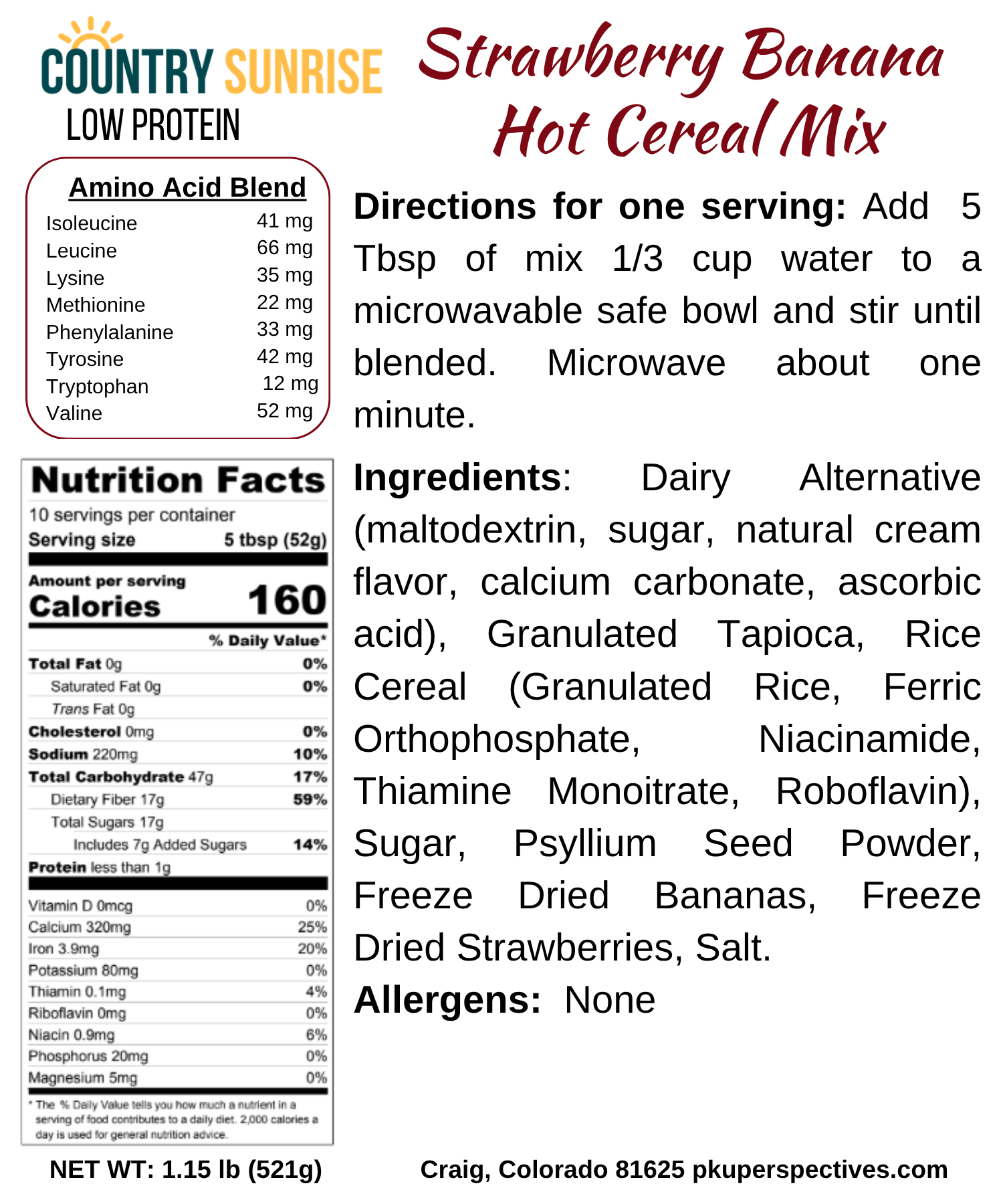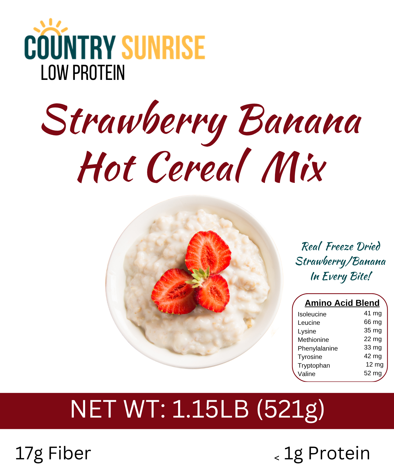 Enjoy a warm, creamy breakfast with Country Sunrise Strawberry Banana Hot Cereal Mix. Made with real strawberries and bananas, this easy-to-prepare cereal is specially crafted for individuals following a low-protein metabolic diet, including PKU.
