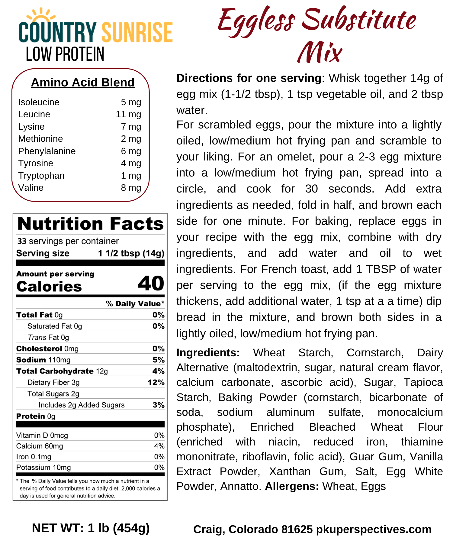 Enjoy fluffy scrambled eggs, golden omelets, or your favorite baked treats — all without the protein. Country Sunrise Eggless Substitute Mix is a versatile, low-protein alternative to eggs that cooks, tastes, and bakes beautifully.