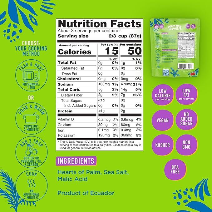 • LOW CALORIE & LOW-CARB RICE: One cup of rice has 45g of carbs and over 200 calories, one cup of Natural Heaven Rice made with hearts of palm has only 4g of net carbs and 50 calories.
