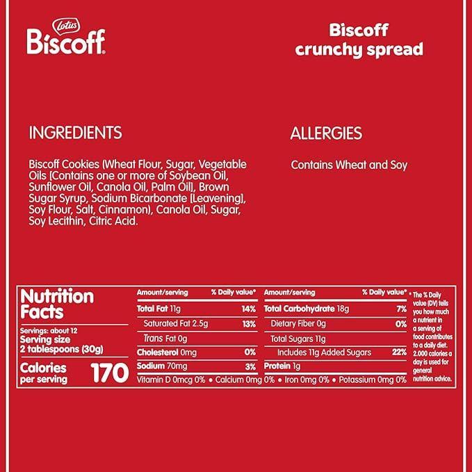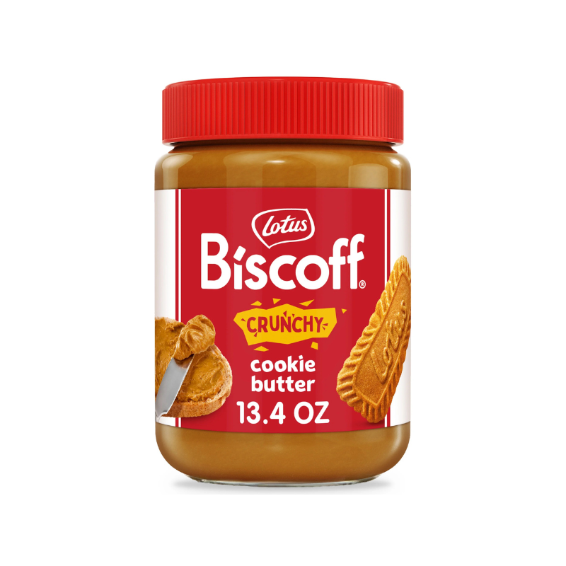 Biscoff fans get ready for a new obsession Crunchy Spread takes the creamy, low protein delight, you already crave and add chunks caramelized Biscoff cookies. Imagine the possibilities: crunchy Biscoff Spread on toast, on waffles, as frosting layers in holiday cookies or tortes or just licked off the spoon. It is made with over 66 Percent Biscoff Cookie.